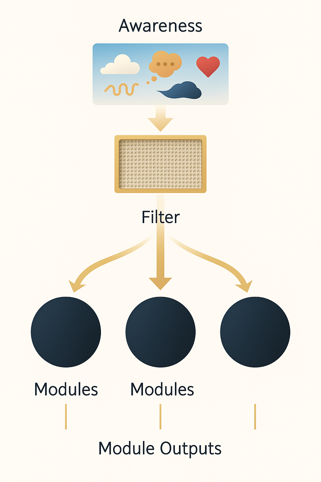 Each module has its own way of working, an inner logic that meets the incoming phenomenon and transforms it. When the module finishes its task, it releases a product, sometimes one, sometimes several. Some sink quietly into the unconscious, disappearing as though into deep water. Others rise again as fresh phenomena, returning to awareness with a new face. At times the outgoing product resembles the original, only softened, sharpened, or clarified. At other times it emerges entirely changed. But whatever form it takes, it is drawn back into the flow, filtered again, and directed to the next module. This cyclical motion unfolds at a speed the conscious mind cannot follow, giving rise to what we call understanding, interpretation, or reaction. It also creates the conditions in which a single experience can be magnified into joy or into suffering.